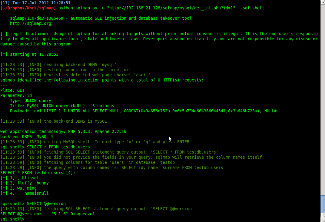 Concatenation of three tamper scripts to obfuscate the injected SQL payloads (switch --tamper):