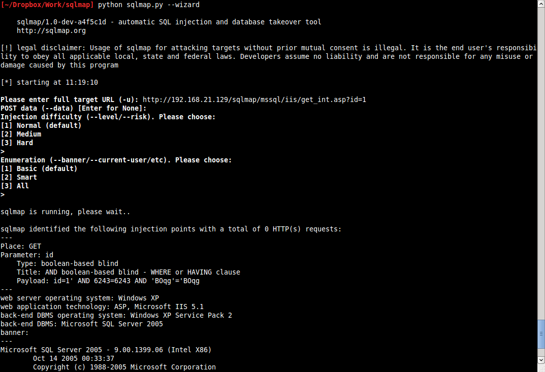 Concatenation of three tamper scripts to obfuscate the injected SQL payloads (switch --tamper):